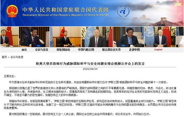 中方坚决反对美国和英国代表对中国的无端指责。他们的说法毫无新意,毫无根据,极其荒谬。恐怖主义是我们的共同敌人。恐怖分子没有所谓好、坏之分。中方坚决反对将反恐问题政治化、坚决反对在反恐中奉行双重标准。