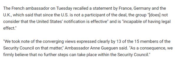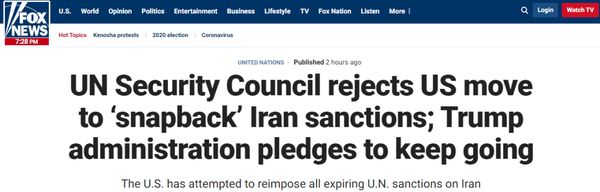 美国福克斯新闻网的报道还提到,法国、英国和德国这些在过去几年里一直被特朗普当局颐指气使的欧洲盟友,也都明确表示他们认为美国已经不再是伊朗核协议的参与国,并认为美国没有资格动用“回退”条款。