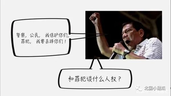 杜特尔特认为:只有守法百姓的生命是需要保护的,而犯罪分子的生命,如同草芥,可以任意践踏、任意摧残,没有人权可言。