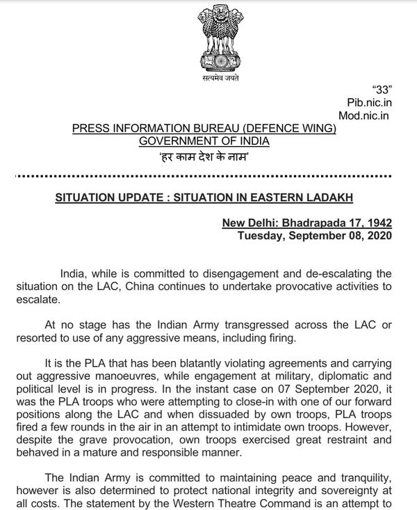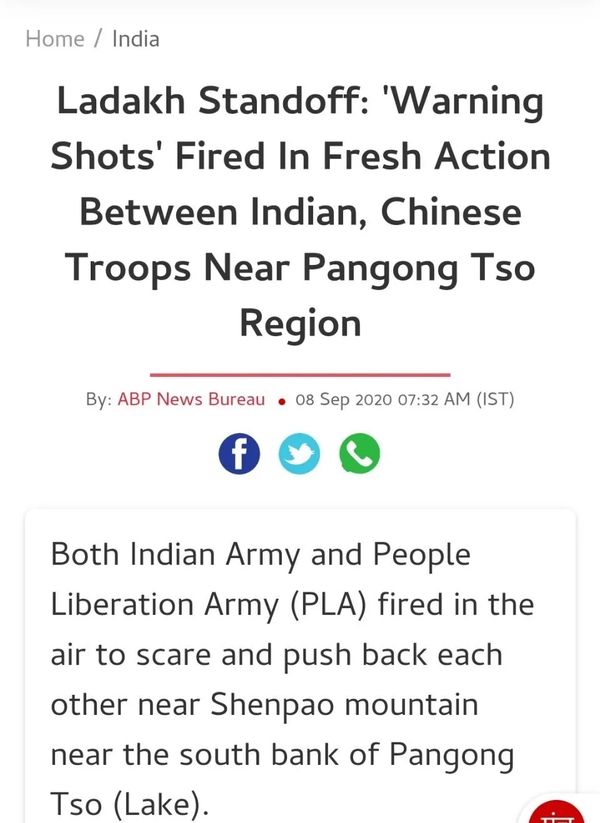 而印度军方在中国方面发布声明后十几个小时,才出来了一份姗姗来迟的声明,声明内容完全倒打一耙,称“2020年9月7日,是中国人民解放军试图接近我们在实控线上的一个前沿阵地,当我们的部队劝阻时,是解放军向空中发射了几发子弹,试图恐吓我们的部队。”