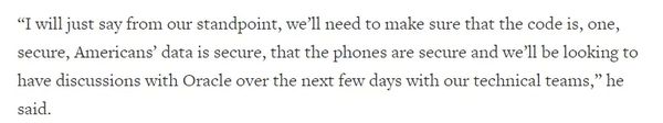 姆努钦14日上午对CNBC表示,美国政府计划在本周对该交易进行审查,“我只是从我们的立场来说,我们需要确保代码是安全的,美国人民的数据是安全的,电话信息是安全的,我们的技术团队期待着与甲骨文接下来的讨论工作。”
