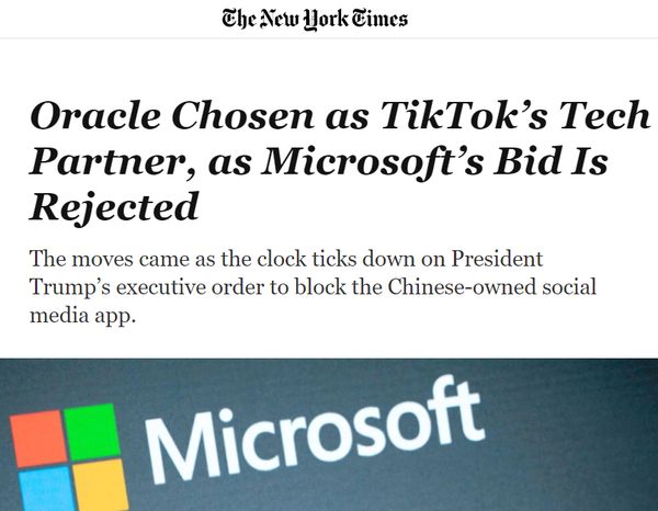 此前,根据美国《纽约时报》报道,曾一度被舆论视为将收购TikTok业务的美国微软公司在今天表示TikTok方面已经拒绝了微软收购,这便令甲骨文公司这家与特朗普当局关系紧密的美国科技企业成为了唯一一家将“收购”TikTok业务的企业。