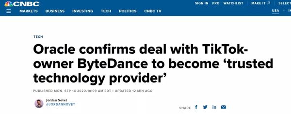 而根据美国CNBC新闻网的报道,甲骨文方面给出的说法也显示双方并不是之前舆论以为的那种完全“收购”的关系。该公司称,中国字节跳动公司确实在周末向美国财政部提交了一份与甲骨文方面合作的协议,其中甲骨文将作为“可信的技术提供方”。