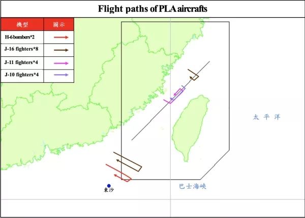 根据台湾方面公布的解放军作战飞机航迹,轰-6K的活动集中在台湾西南方向;歼-16同时在台湾西南和西北出现,歼-10和歼-11则集中在台湾西侧中线附近。必须指出的是,这未必是解放军作战飞机的真实航迹。