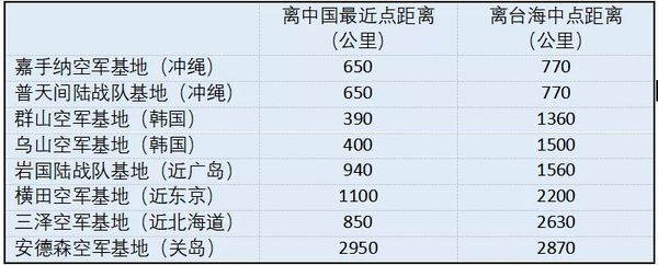 其中有些不适合保障大规模空中作战,比如普天间只有一条2700米跑道,以保障直升机为主。由于政治原因,韩国的乌山和群山未必能用于台海作战。除关岛的安德森以外,所有美国基地都在东风16和17的射程范围,安德森则在东风26的射程范围之内。