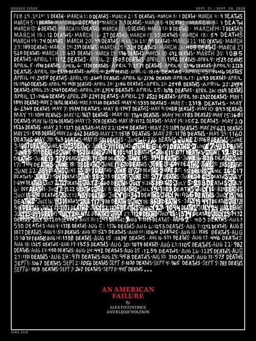 ——9月10日,美国时代周刊封面刊登最新一期美国死亡病例,20万人。图片下方用红色的字眼醒目的表示道:一个美国式的失败!