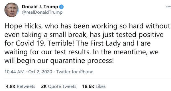 就在刚刚,特朗普在推特上发文谈及此事,表示他将和第一夫人即将开始进行隔离。他写道:“霍普·希克斯一直在努力工作,甚至都没有休息一会儿,她刚刚新冠病毒检测呈阳性。糟糕!第一夫人和我正在等待我们的检测结果。同时,我们将开始我们的隔离程序!”