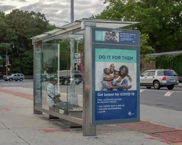 △美国纽约布鲁克林一个公交车站的免费核酸检测广告 (图片来源:《纽约时报》)