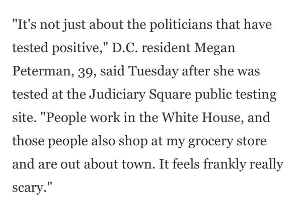 华盛顿居民梅根·彼得曼在当地时间6日做了核酸检测,她说:“最近许多白宫官员确诊新冠肺炎,白宫工作人员也可能来过我的商店购物,感觉挺吓人的。”