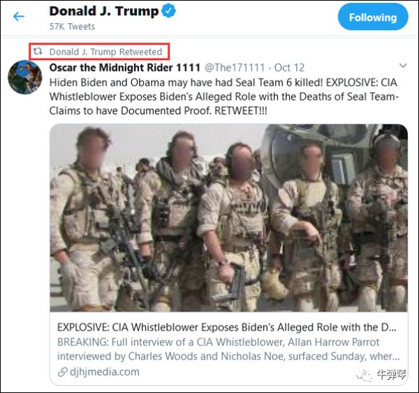 比如,特朗普转发的第一条,是来自一个名为QAnon阴谋论组织的关联账号。