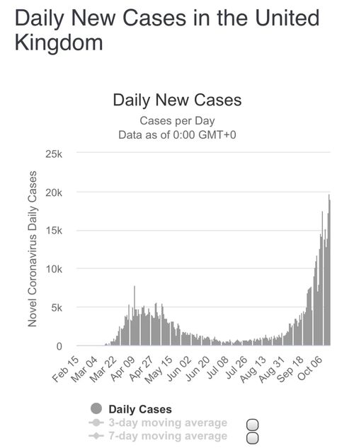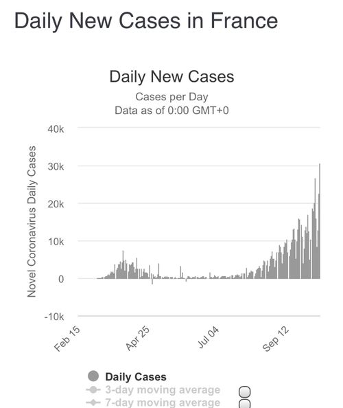 时间进入10月,新冠疫情在夏天没有消失,只是在短暂歇息之后,又在全球开始了第二波。在欧洲,这第二波虽然目前死亡数不高,但是感染人数远远超过第一波。10月12日,法国总理卡斯泰在接受当地媒体采访时表示,由于新冠疫情持续发展,法国“第二波疫情已成事实”,“防疫工作不可松懈”。为了抗疫,从10月17日起,法国八个城市将在晚上实施宵禁。