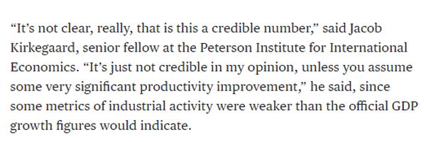 怎么别扭呢?首先,这篇报道一上来先采访了一名来自美国彼得森国际经济研究所的学者,而此人则表示他并不相信中国第三季度的GDP能有4.9%的增长,认为这个数字“不可信”。