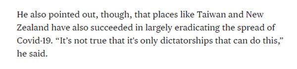 之后,这篇标题里挂着“美国可以学习中国”内容的文章中一个最奇葩的地方就出现了:它突然宣称美国可以去学中国台湾省和新西兰,并称这俩“民主”的地方证明了防疫并不需要“专制”的体制。