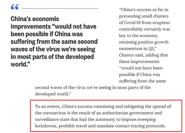 但接下来,这篇文章又称,即便中国的GDP官方数据存疑,经济学家们也都同意中国的经济在复苏,并提到IMF就认为中国2020年的经济增速为1.9%,是全球主要经济体中唯一一个能在今年迎来增长的。对此,另一名接受NBC采访的经济学家就表示,在第一波新冠疫情过去后,中国对新出现的聚集性病例能有效地采取措施,不让其出现西方国家的那种进一步恶化和二次疫情的情况,是令中国经济在第三季度能出现积极增长的一个主要原因。