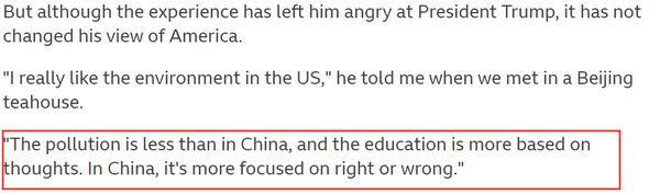 他甚至还搬出一个中国留学生的说法称,美国的空气更香甜,大学鼓励思考,而中国只会教你对错。