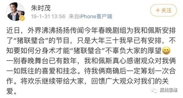 2019年网上甚至谣传了一份节目单,称这对搭档将惊喜表演小品《猪联璧合》,随后被朱时茂发微博否认,感谢观众们一如既往的喜爱和挂念,许诺称两人日后一定筹划一次合作。