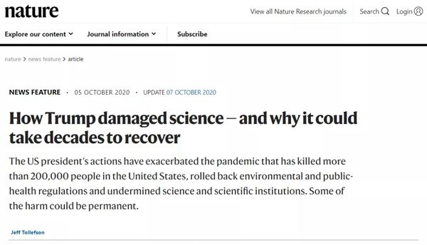 Nature:无论谁输谁赢,特朗普这四年对美国科学界的破坏,都需要几十年才能修复!