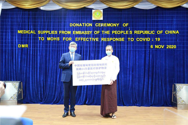 11月6日,中国驻缅甸使馆向缅甸政府捐赠24万套医疗防护物资仪式在缅甸卫生与体育部仰光大楼举行。中国驻缅甸大使陈海出席并同在首都内比都的缅甸卫生与体育部部长敏推视频致辞。