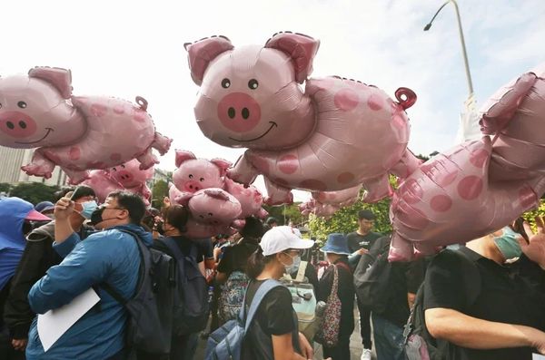 台湾民众党也举着猪气球、标语,表达“清楚标示”、“源头管理”等诉求,批评民进党当局“完全不负责任”、希望把“蔡英文政府”叫醒。