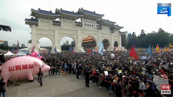 接近中午,凯道两侧已有身着黑衣的民众聚集,凯道上也以行动货车架起灵堂,播放民进党政客今非昨是的对比言论,悼念“莱猪毒台、民主已死”;更有示威人士将活猪带到活动现场,表示对民进党当局罔顾民意,执意开放“莱猪”的抗议。