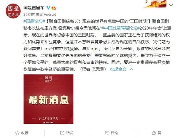 所以这个周末,中国一宣布进军CPTPP,很多网友就笑出了声。恰巧前几日,村委会(联合国)副村长法布里齐奥·霍克希尔德忧心村里局势,声称我们正处于“三国时期”。有网友因此笑称: