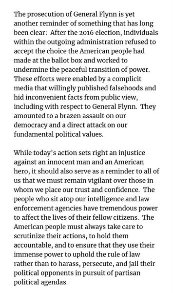 声明如下:“特朗普特赦弗林,是因为他不应该受到起诉。司法部对弗林的独立调查也支持这个结论,并且应该撤销对弗林的指控。弗林不需要被赦免,他本来就是无辜的。多项调查证明弗林是试图颠覆2016年大选的党派斗争的受害者。弗林的案子再次提醒人们:2016年大选后,奥巴马政府的官员拒绝承认美国人民的选择,并且试图破坏和平权力过渡。(民主党人看到这句话就呵呵了。。。)