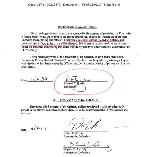 11月30日,弗林签署认罪协议,他对向FBI撒谎认罪,作为交换,弗林的儿子不会受到指控。不过,弗林并没有因为收受外国资金而逃脱指控。12月18日弗林出庭做量刑聆讯,米勒团队并没有建议让弗林坐牢,但是法官沙利文(Emmet Sullivan)认为,弗林可以说出卖了国家,为什么他不被控“叛国罪”?于是判刑被推迟。