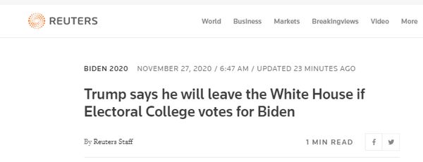 路透社消息也说,特朗普表示,如果拜登被选举人团认定为选举获胜者,他将离开白宫。拜登将于明年1月20日举行就职典礼。