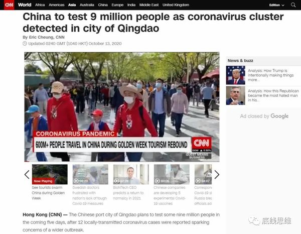 当地时间10月13日,CNN报道了青岛市的检测计划。在同一个页面上,读者还能够看到一个关于6亿多人次国庆假期出游的视频