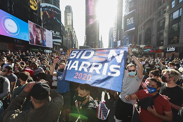 11月7日,拜登的支持者聚集在美国纽约时报广场庆祝。图|新华社