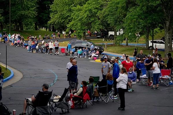 2020年6月18日,申请失业救济的人们在美国肯塔基州法兰克福排队等待就业中心开门。图|新华社