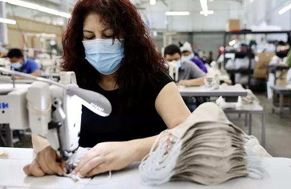 2020年4月16日,在美国洛杉矶的一家工厂内,工人们在缝制口罩。图|新华社