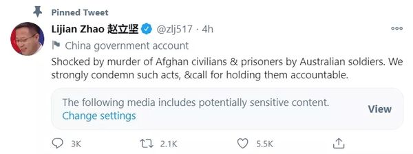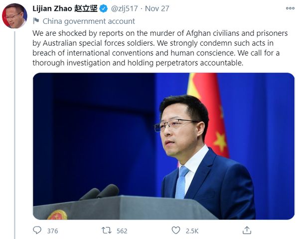 赵在推特上写道:“对澳大利亚士兵谋杀阿富汗平民和囚犯感到震惊。我们强烈谴责这种行为,并要求追究他们的责任。”