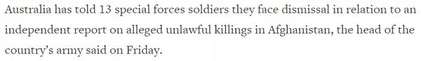 据悉,目前澳方已告知13名特种部队士兵,他们将因一份有关在阿富汗非法杀人的独立报告而面临解雇。