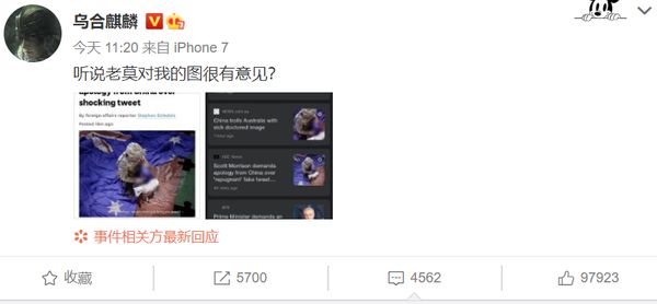 也正因此,当这张图片出现在中国外交部发言人赵立坚周一发布的推文中时,莫里森立马就暴走了。