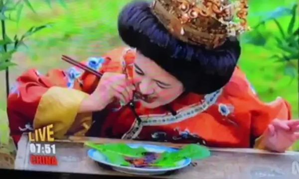 一名白人女性装扮成中国女皇武则天,并挑战吃下蟑螂、竹鼠、黄蜂幼虫等让人闻风丧胆的“食物”。