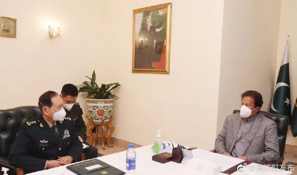12月1日,巴基斯坦总理伊姆兰•汗在伊斯兰堡会见到访的中国国务委员兼国防部长魏凤和。李晓伟摄