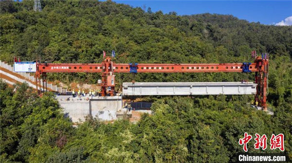 大瑞铁路保山至瑞丽段桥隧比高达69.76%,共需要架设T梁689孔1378片。随着户育2号大桥完成第一片T梁架设,标志着大瑞铁路保山至瑞丽段全线架梁工程全面铺开,制、运、架梁进入良性循环,为后续高效推进项目建设提供有力保障。