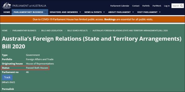 12月3日,澳大利亚议会通过一项最新立法,该法案赋予澳联邦政府权力,可否决各州、议会或机构与外国政府之间所签署的任何协议。
