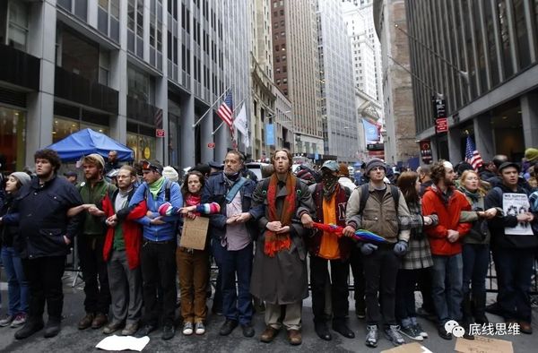 2011年11月17日,数百名“占领华尔街”示威者在纽约华尔街附近集会游行,并一度封堵通往纽约证券交易所的街道(图源:新浪图片)