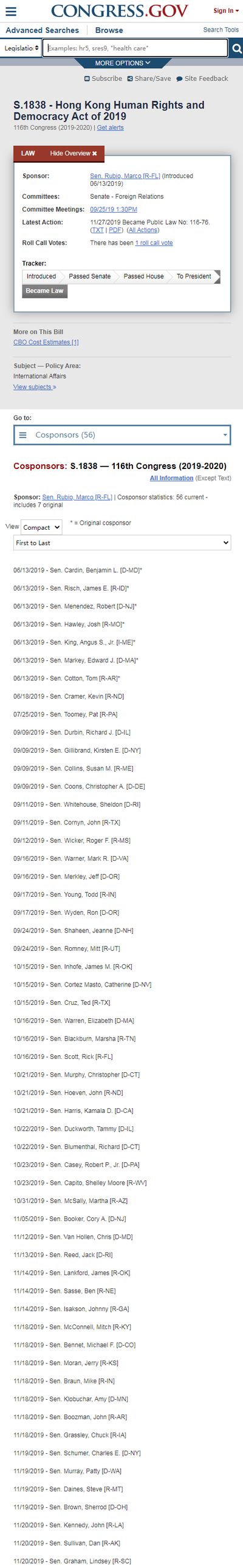 以及其他支持《香港人权与民主法案》的参议员如下: