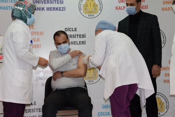 图片|图/11月25日,在土耳其东南部的迪亚巴克尔,一名参加试验的志愿者接种了CoronaVac疫苗。
