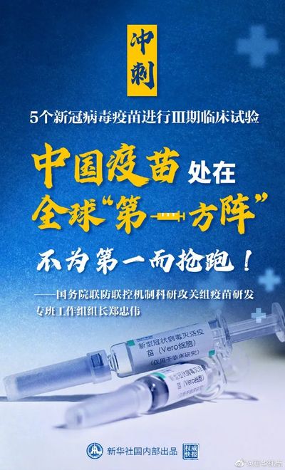 “我国目前已有5个新冠病毒疫苗进行Ⅲ期临床试验,数量位于全球前列。”国务院联防联控机制科研攻关组疫苗研发专班工作组组长、国家卫健委医药卫生科技发展研究中心主任郑忠伟日前接受新华社记者专访时说,“疫苗研发已经进入冲刺阶段,我们处于全球第一方阵,但不为第一而抢跑。”