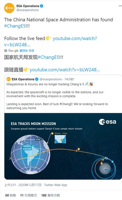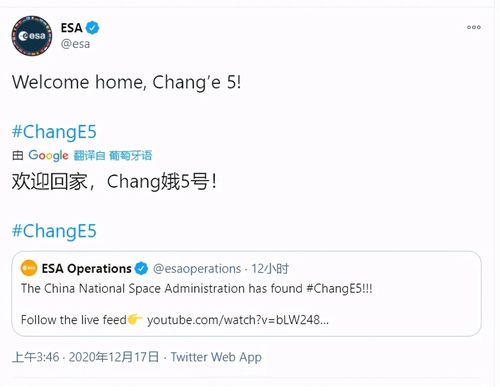 ▎欧洲宇航局十分欢迎嫦娥五号返回地球