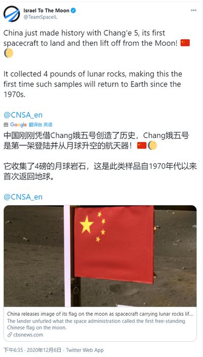 ▎以色列方面曾祝贺嫦娥五号成功采集样品
