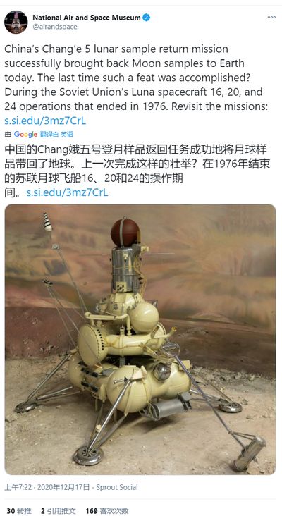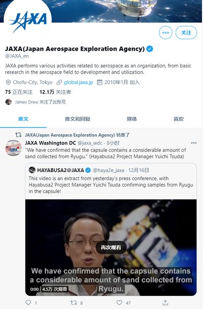 相比顾左右而言他的其他国家,美国和日本的态度则有意思得多,比如日本航天航空局(JAXA)就在首页展示了太空探测器“隼鸟2号”发回地球的密封舱,2014年飞向太空的“隼鸟2号”,分别于2019年2月和7月,在小行星“龙宫”着陆,并在含有碳的这颗行星上采集了部分样本。据共同社报道,日本宇航研发机构(JAXA)12月15日举行在线记者会,介绍在“隼鸟2号”密封舱内发现的黑色沙粒样本。教授津田雄一表示,“已确认密封舱内有显然是在‘龙宫’采集的相当数量的沙子”。他说隼鸟2号“100%完成了取样送回地球的任务”。而NASA则属于阴阳怪气最顶级了,比如在嫦娥5号返回地球后,NASA就表示即将执行重返月球的载人航天任务,显然并没有将中国嫦娥五号返回地球当作一回事。更有甚者,美国NASA旗下众多账号中仅有美国国家航空航天博物馆对此进行了回应,而与其说回应倒不如说是嘲讽。美国国家航空航天博物馆就表示:中国嫦娥五号成功返回地球将月球样本带回了地球,而上一次完成这样的壮举是1976年的苏联“月球”24号飞船任务。
