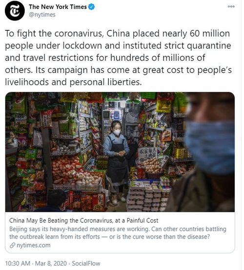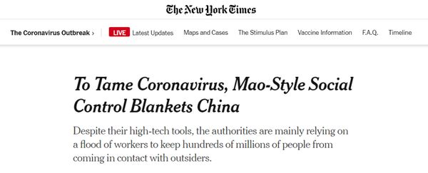 讽刺的是,此刻正在耍弄“事后诸葛亮”、质问中国为什么不在去年年底就封城的《纽约时报》,当时却在中国通过将武汉封城来告诉全世界这个病毒有多危险后,不断撰文抹黑我们的防疫措施,用充满意识形态偏见的语言宣称我们的防疫措施是“残忍”、代价“巨大”的,甚至还说我们“伤害了全球经济”的。