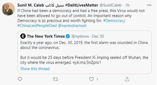 当然,也有一些人很认同《纽约时报》对中国的抨击。比如下面这位印度网民就一本正经地写道:如果中国是一个“民主国家”并拥有“传媒自由”,病毒就不会失控了……