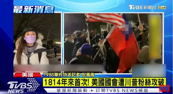 有几位眼尖的台湾网民发现,在CNN直播画面中,有一位抗议者手持“青天白日旗”出现在了国会山抗议现场。而台湾TVBS新闻更是在新闻中插入了一段“抗议者挥舞‘青天白日旗’”的近距离视频。