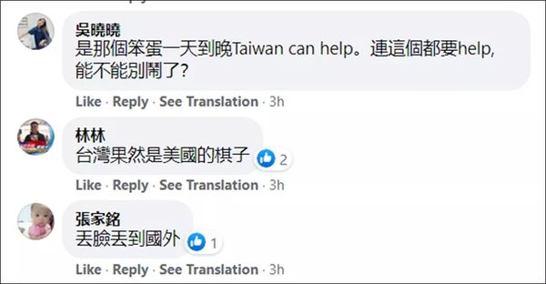 同样是针对那句口号,有网民则嘲讽道:“是哪个笨蛋一天到晚Taiwan Can Help,连这个都要help,能不能别闹了?”